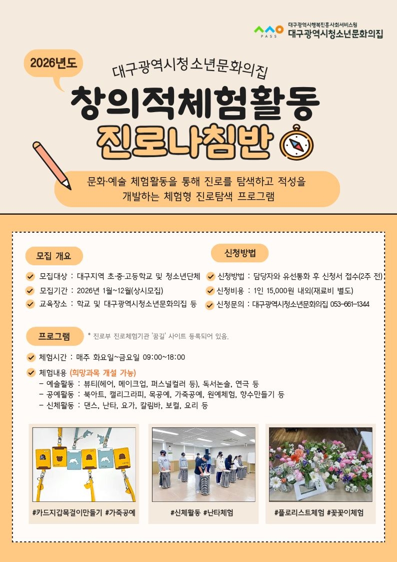 나. 문 의 : 대구광역시청소년문화의집 프로그램 담당자(☎053-661-1344)