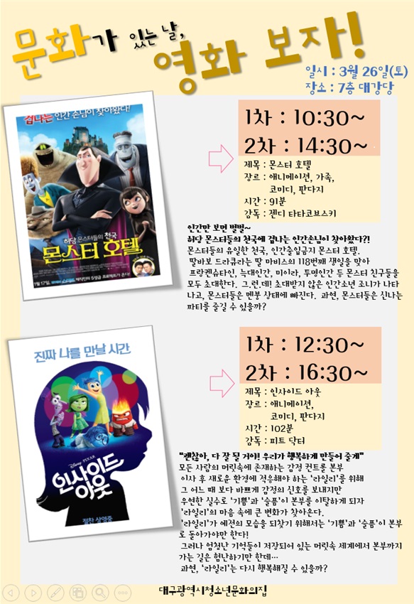 영화상영] 문화가 있는 날, 영화보자[몬스터 호텔, 인사이드 아웃]