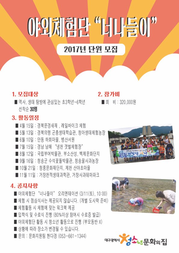 대구시청소년문화의집에서 야외체험단 너나들이를 모집하고 있습니다.
