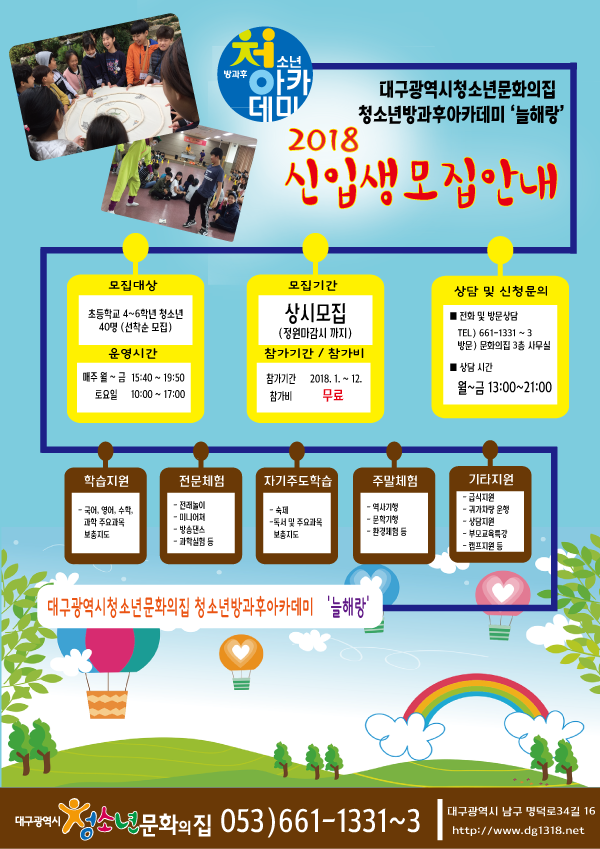 ○ 주요프로그램: 자기주도학습 (숙제『과제물』, 독서 및 주요과목 보충 지도) 전문체험활동 (전래놀이, 미니어쳐, K-POP댄스, 과학실험 등) 주말 체험활동 (역사기행, 문학기행, 환경체험 등) 실시 기본공통과정 (국,영,수 과 주요과목 지도) 급식지원 및 귀가지도 차량운행 기타 : 상담지원, 부모교육특강, 캠프지원 등 ○ 참가기간 및 참가비: 2018. 1. ~ 2018. 12.(참가비 무료) ○ 상담 및 신청문의: 661-1331~3(13:00 ~ 21:00 상담 및 신청가능 )