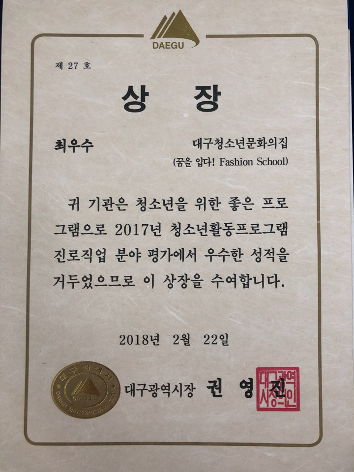 2017 청소년활동프로그램 우수프로그램으로 꿈을입다 패션스쿨이 수상하게되었습니다.