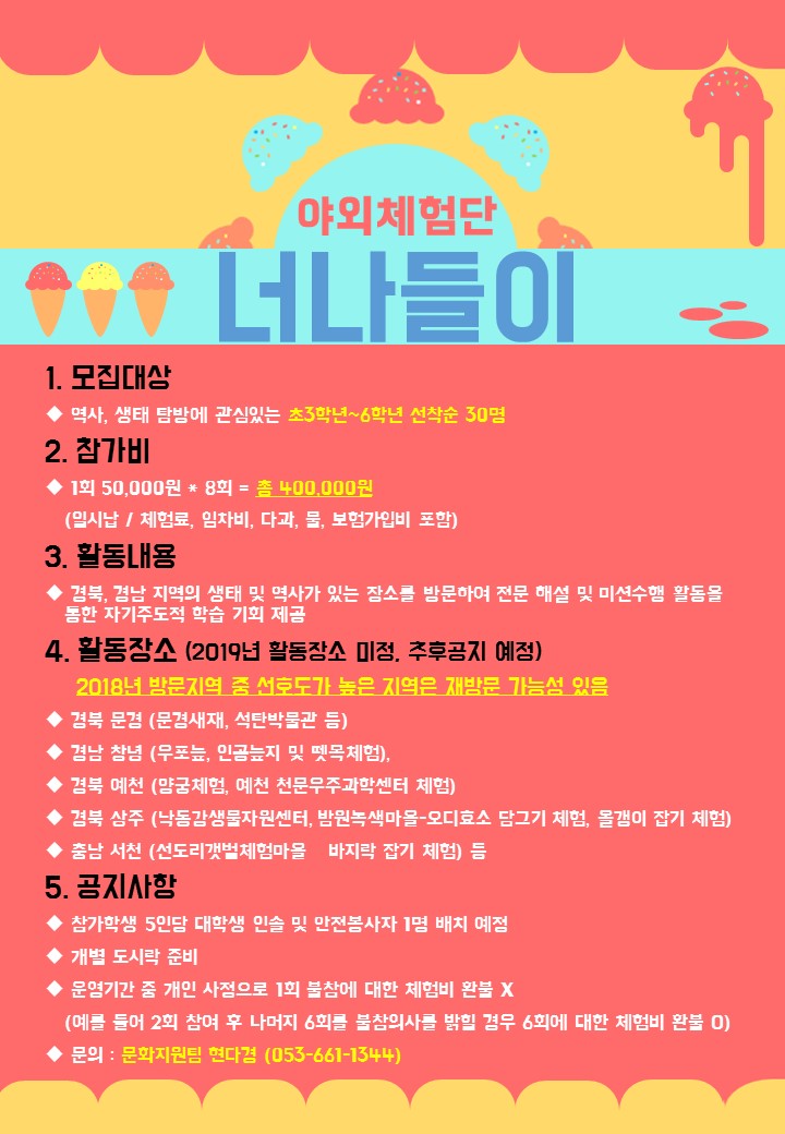 - 온라인 접수 : Arteen 예술놀이터 → 체험학습 → 너나들이 신청 후 계좌이체 (504-10-177014-3 / 대구은행)