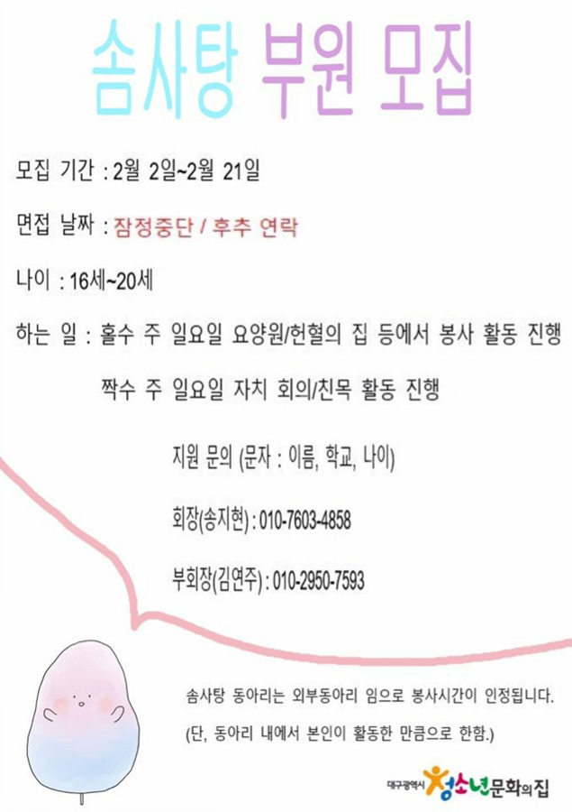 ✔ 지원 방법 : [이름/학교/나이] 작성 후 임원에게 문자, 카톡, 페메로 보내주세요.
