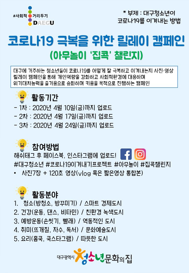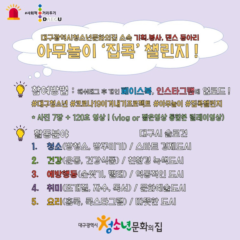 #대구청소년 #코로나19이겨내기프로젝트 #아무놀이 #집콕챌린지 해쉬태그 후 개인 페이스북, 인스타그램에 업로드!
