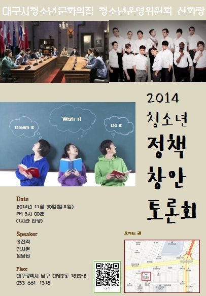 청소년운영위원회 신화랑이 청소년이 행복한 대구를 위해 청소년의 눈높이에서 청소년정책에 대한 고민을 논의하고자 청소년 정책창안 토론회를 개최합니다. 관심있는 청소년들의 많은 참여부탁드립니다. 일시 : 2014년 11월 30일 장소 : 문화의집 대강당
