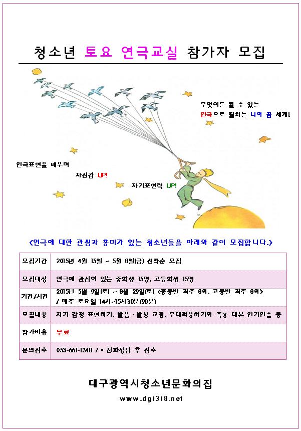 - 연극에 관심이 있거나 연기를 배워보고 싶은 청소년들 토요 연극교실에 참가하여 배워볼 수 있는 기회가 되오니 많은 관심과 참여 바랍니다. - 모집은 전화 상담 후 접수 가능하오니 참고 바랍니다. - 연극에 대해 더 궁금한 사항이 있으시다면 아래의 참가자 모집요강과 강의계획표를 참고해주세요^^