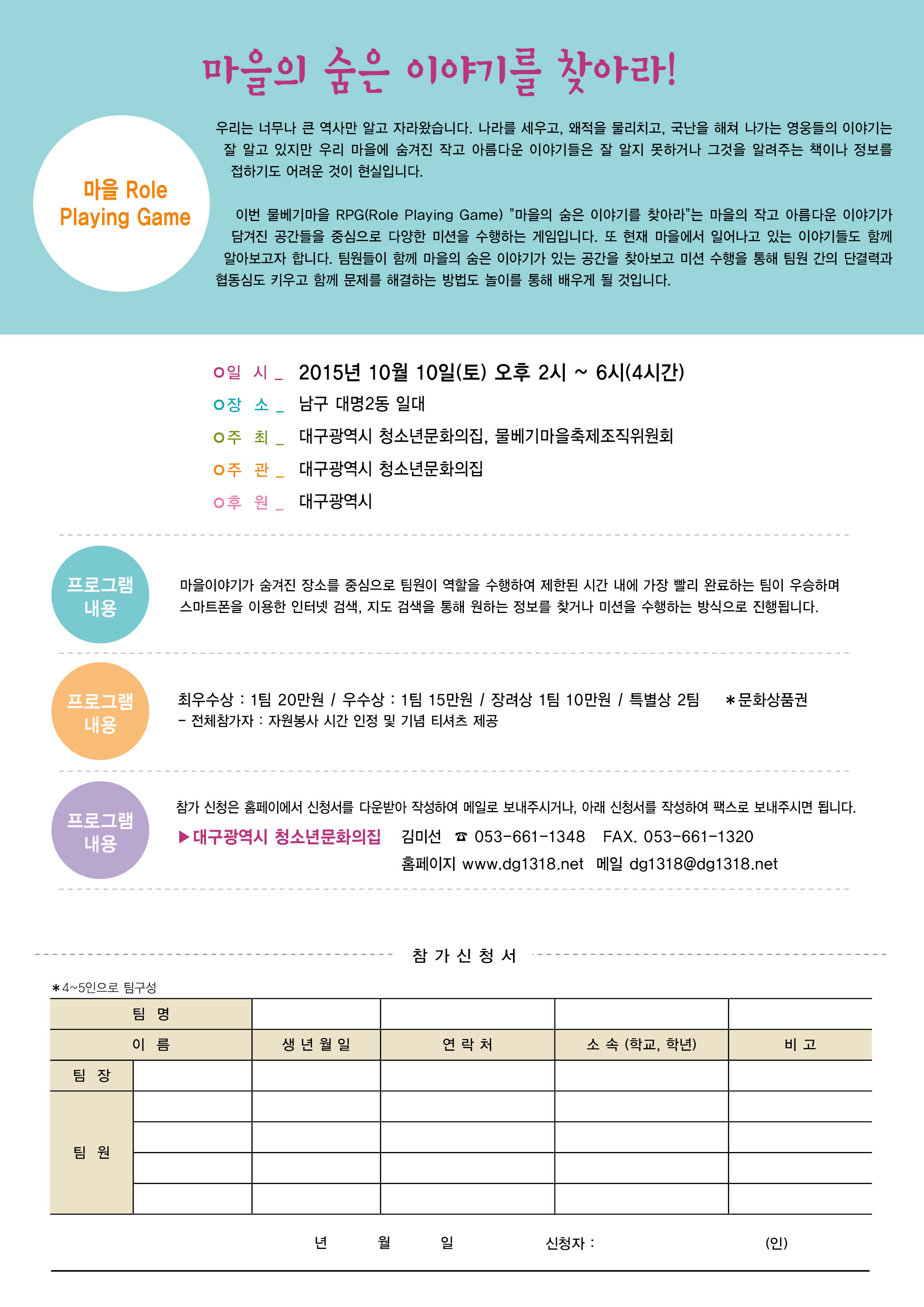 제4회 마을RPG-"마을의 숨은 이야기를 찾아라"에 참가할 팀을 모집합니다.날짜 : 2015년 10월 10일(토) 2시~6시장소 : 대명동 일대 (문화의집 앞에서 출발)신청자격 : 4~5명의 청소년으로 구성된 팀이면 누구나신청방법 : 신청서를 다운받아 작성한 후 신청 ( 이메일 - dg1318@dg1318.net / 팩스 - 053-661-1320 / 내방 ) 문 의 처 : 053-661-1348 (청소년사업팀 김미선)