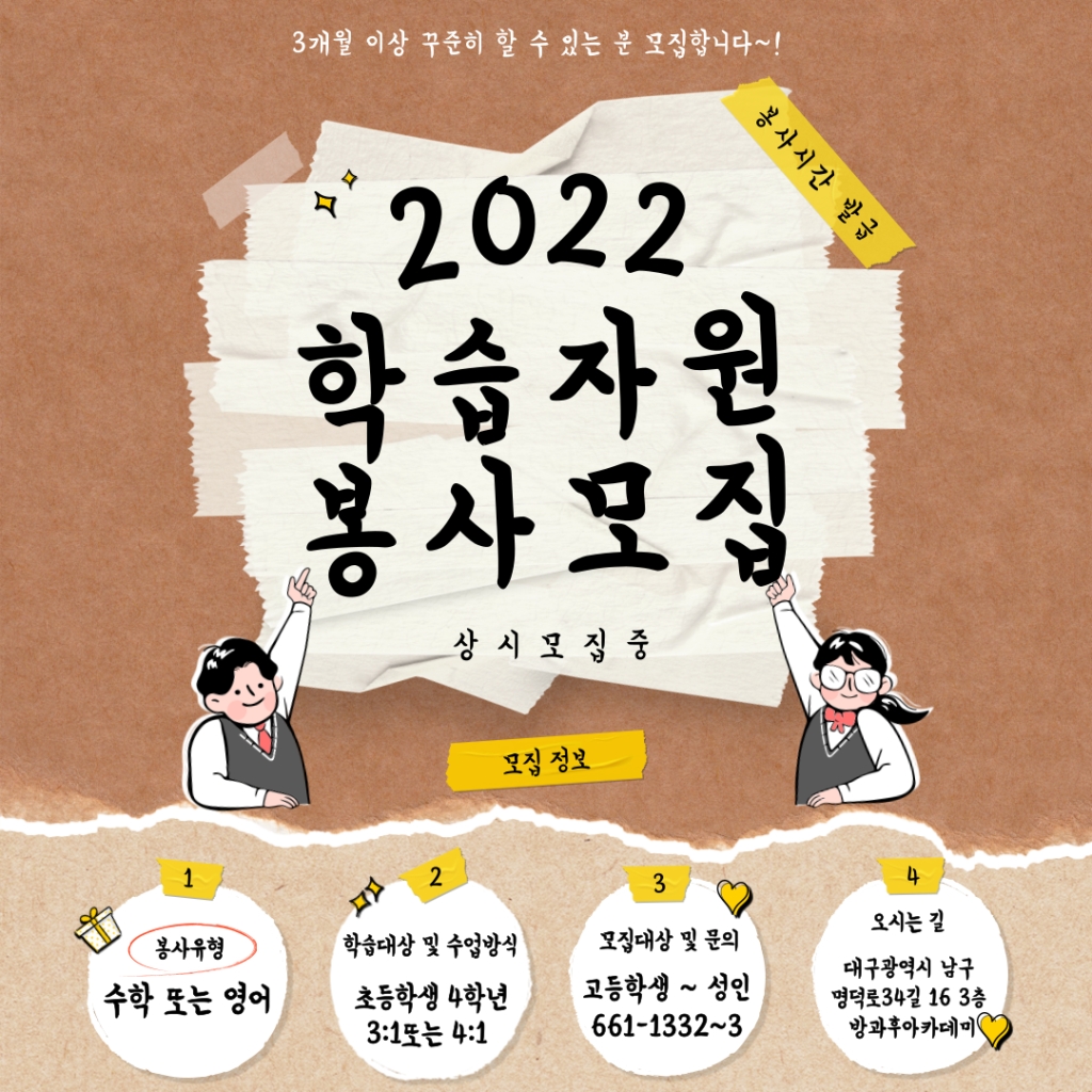 대구시청소년문화의집 방과후아카데미에서 학습자원봉사자(수학, 영어)를 모집합니다.