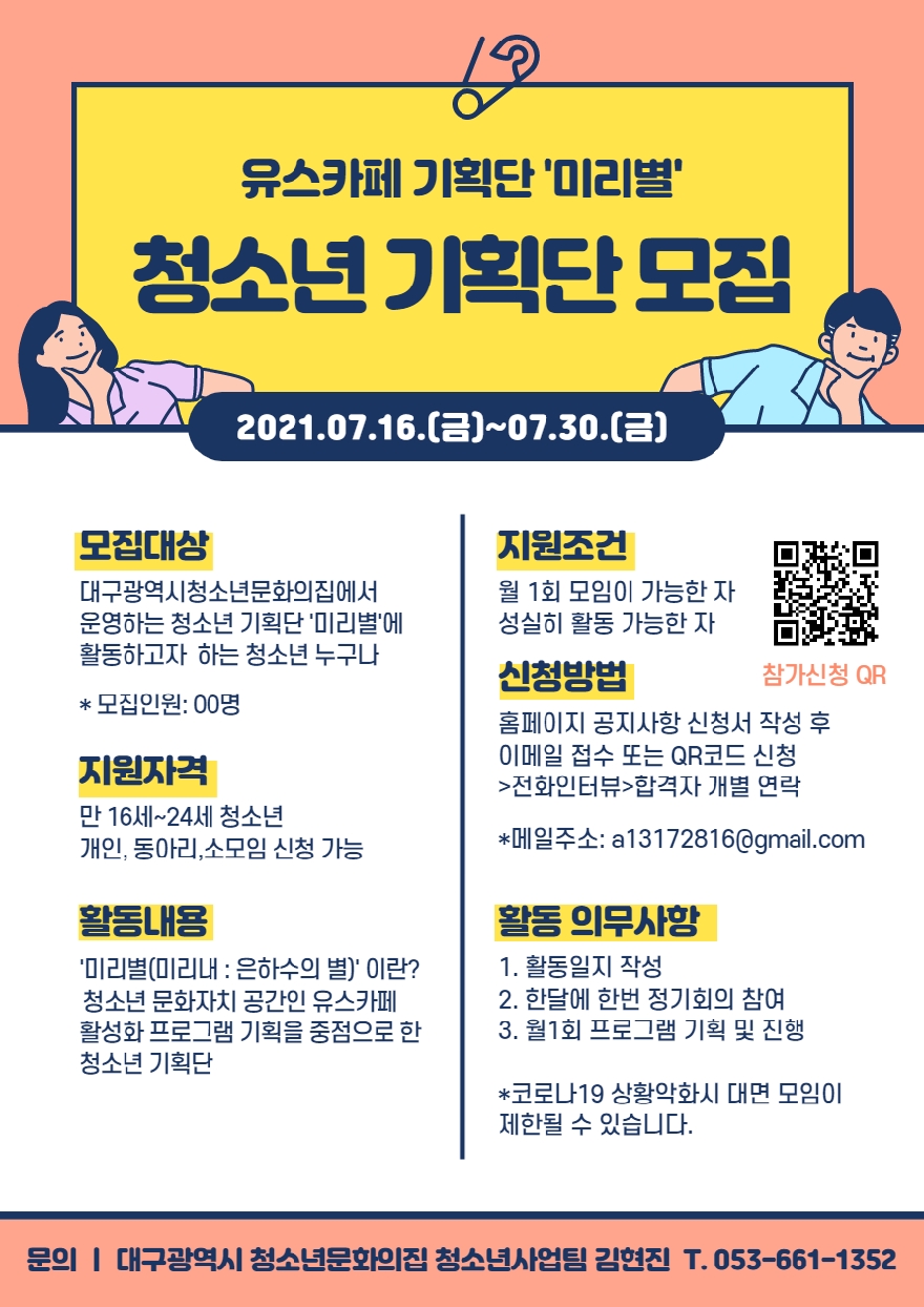 유스카페 활성화 프로그램 기획을 중점으로한 청소년기획단 '미리별'을 아래와 같이 모집하오니 많은 관심과 참여 부탁드립니다. :-)