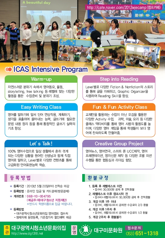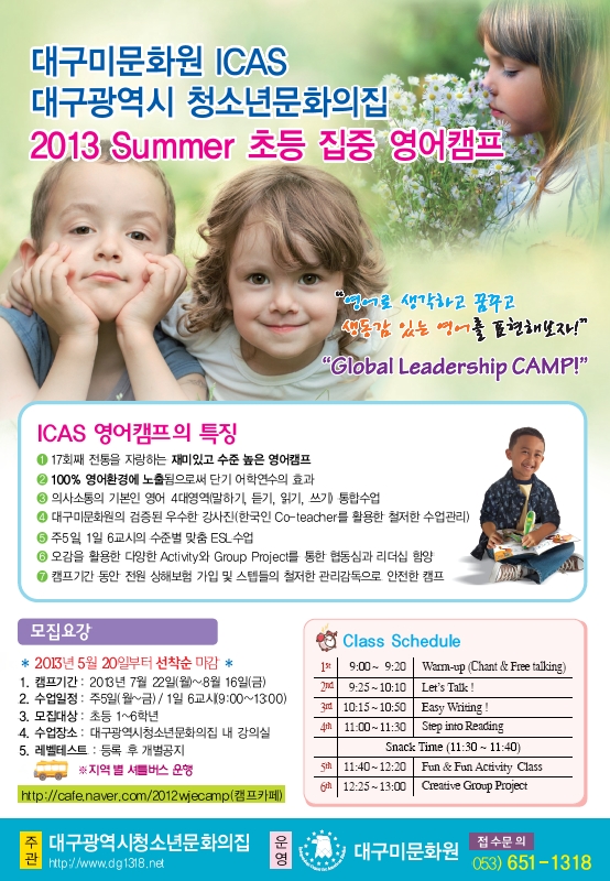 대구미문화원과 함께하는 초등 집중 영어캠프 접수가 시작되었습니다. 선착순으로 모집중이니 서둘러주세요!문의사항은 053)651-1318 으로 연락주세요.(네이버카페 http://cafe.naver.com/2012wjecamp)